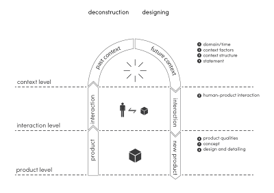 Het eerste gedeelte van ViP (link in het figuur hierboven) bestaat uit een grondige kijk op de huidige situatie. Op de drie verschillende niveaus ( product, interactie en context) heb ik gekeken naar museum objecten op zich, de tentoonstelling waar ze in staan en het Booijmans als museum. In de analyse heb ik geprobeerd een zo compleet mogelijk beeld te krijgen van alle factoren in en om het domein, waarbinnen ik vervolgens een ontwerp uitdaging heb gecreëerd: